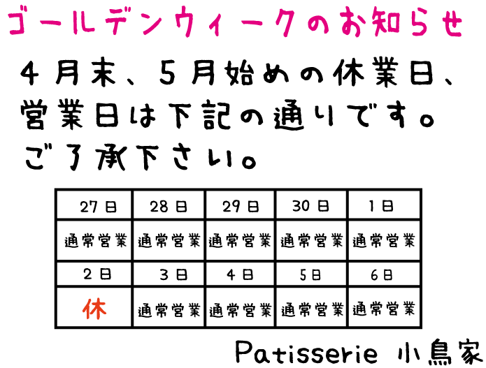 カテゴリを選ぶ お知らせ イベント情報 定休日のお知らせ 月別アーカイブ 2026年1月 2025年12月 2025年10月 2025年9月 2025年8月 2025年5月 2025年4月 2025年3月 2025年2月 2024年12月 2024年11月 2024年7月 2024年6月 2024年4月 2024年3月 2023年12月 2023年11月 2023年10月 2023年8月 2023年6月 2023年5月 2023年4月 2023年2月 2022年11月 2022年10月 2022年8月 2022年5月 2022年2月 2022年1月 2021年12月 2021年11月 2021年2月 2020年12月 2020年11月 2020年10月 2020年5月 2020年2月 2019年12月 2019年11月 2019年7月 2019年5月 2019年4月 2019年3月 2019年2月 2018年12月 2018年11月 2018年9月 2018年6月 2018年5月 2018年2月 2017年12月 2017年11月 2017年9月 2017年5月 2017年4月 2017年2月 2017年1月 2016年12月 2016年11月 2016年10月 2016年9月 2016年3月 2016年2月 2015年11月 2015年10月 2015年6月 2015年5月 2015年2月 2015年1月 2014年12月 2014年11月 2014年10月 2014年9月 2014年7月 2014年6月 ☆ゴールデンウィークの休業日のお知らせ☆ HOLIDAY2019.02.26 ゴールデンウィークの休業日は以下の通りです。 5日2日の木曜日はお休みをいただきます。ご了承ください。