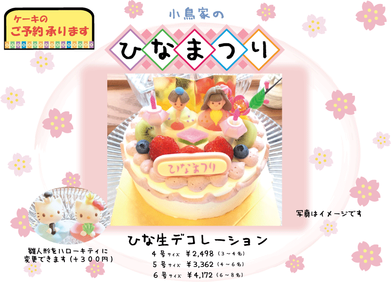 カテゴリを選ぶ お知らせ イベント情報 定休日のお知らせ 月別アーカイブ 2026年1月 2025年12月 2025年10月 2025年9月 2025年8月 2025年5月 2025年4月 2025年3月 2025年2月 2024年12月 2024年11月 2024年7月 2024年6月 2024年4月 2024年3月 2023年12月 2023年11月 2023年10月 2023年8月 2023年6月 2023年5月 2023年4月 2023年2月 2022年11月 2022年10月 2022年8月 2022年5月 2022年2月 2022年1月 2021年12月 2021年11月 2021年2月 2020年12月 2020年11月 2020年10月 2020年5月 2020年2月 2019年12月 2019年11月 2019年7月 2019年5月 2019年4月 2019年3月 2019年2月 2018年12月 2018年11月 2018年9月 2018年6月 2018年5月 2018年2月 2017年12月 2017年11月 2017年9月 2017年5月 2017年4月 2017年2月 2017年1月 2016年12月 2016年11月 2016年10月 2016年9月 2016年3月 2016年2月 2015年11月 2015年10月 2015年6月 2015年5月 2015年2月 2015年1月 2014年12月 2014年11月 2014年10月 2014年9月 2014年7月 2014年6月 ☆ひなまつりケーキご予約承り中☆ NEWS2020.02.18 雛生デコレーションケーキ ふわふわスポンジとこだわりのブレンド生クリームで苺をサンドしました。 4号 2,498円 5号 3,362円 6号 4,172円 ケーキ代金にプラス300円でキティちゃんのお人形に交換できます。